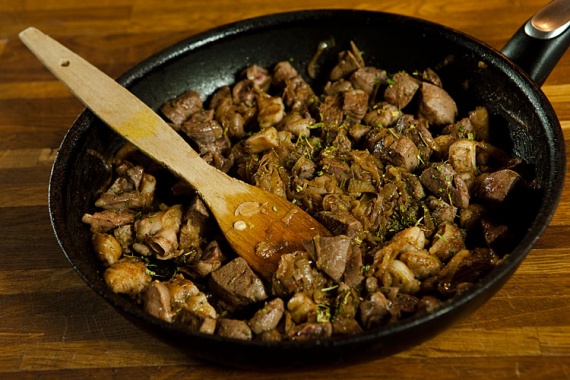 Первым на сковородку отправляется сало. Едва сало выпустит немного жира и не успеет ещё даже зазолотиться, как к салу добавляется лук. Как только лук станет прозрачным, в сковородку выкладывается мясо. Не надо ждать, когда на мясе образуется корочка. Будет довольно и того, что мясо станет полу готовым и побелеет. Тогда в сковородку отправляется сердце, через некоторое время почки и, в последнюю очередь, по праву самого нежного продукта – печень.