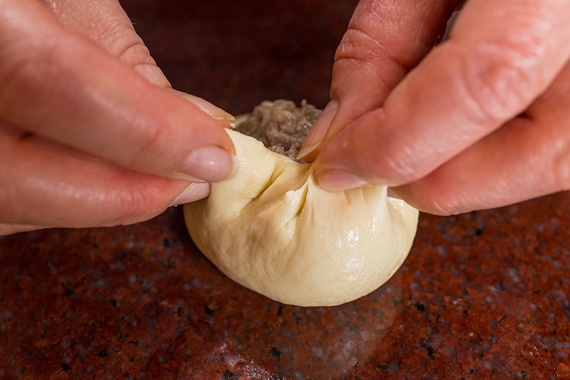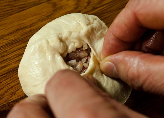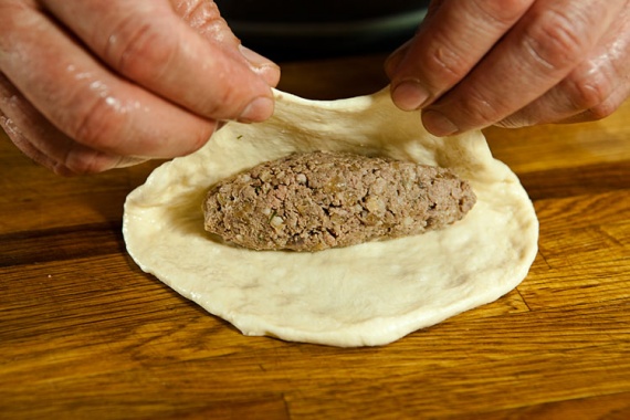Внесите фарш и пусть он согреется до комнатной температуры. В середину лепёшки положите 40-50 грамм фарша и распределите его по углублению ровным слоем. Старайтесь не очень-то давить на фарш – под ним нежное тесто! Нам очень важно сохранить его нежность. Берите тесто за бортики, оттягивайте его наверх и формируйте из него складки.