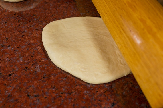 Придавите шарик теста в середине и, работая подушечками пальцев, сделайте небольшое углубление, одновременно раздвигая заготовку до размеров чайного блюдца. У вас должно получиться нечто, похожее формой на узбекскую лепёшку.