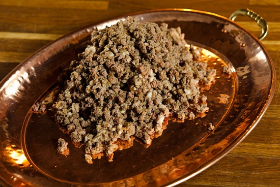 Самое время заняться фаршем. Мясо либо порежьте полукруглым ножом, либо изрубите топориком, а лук порежьте мелко и подавите его вместе с солью.