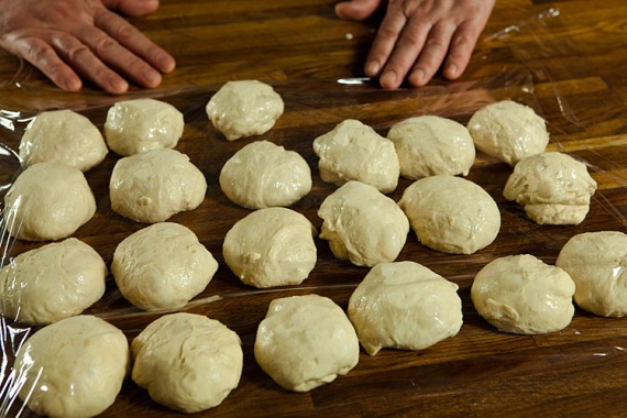 Когда все шарики будут готовы, а всего из замешанного теста их получится примерно 20-22 штук, укройте их пищевой плёнкой и оставьте ещё раз подходить.