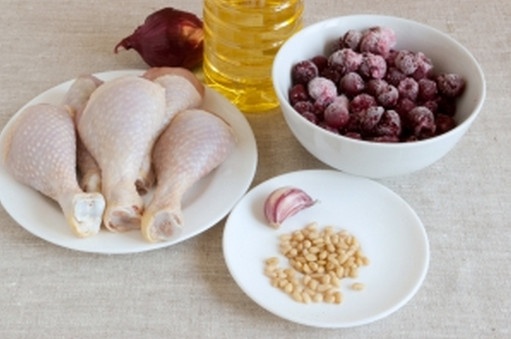 Подготовить куриные голени, красный лук, зубочек чеснока, вишню, масло растительное, кедровые орешки.