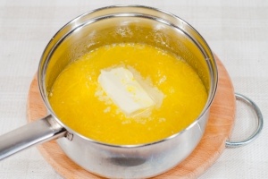 Перелейте смесь в кастрюлю. Добавьте кусочек сливочного масла. Поставьте на медленный огонь.