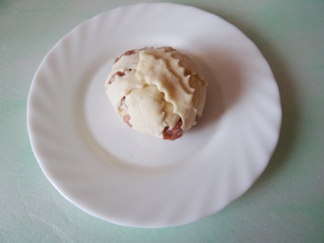 Каждый шарик нужно обмотать полосочками теста, так чтобы получилось что-то наподобие клобочка ниток. Теперь эти клубочки смазываем желтком и помешаем в духовку на полчаса для выпечки.