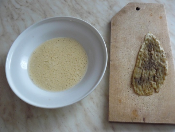 Очистить баклажан. Нарезать его вдоль на пластинки толщиной в сантиметр