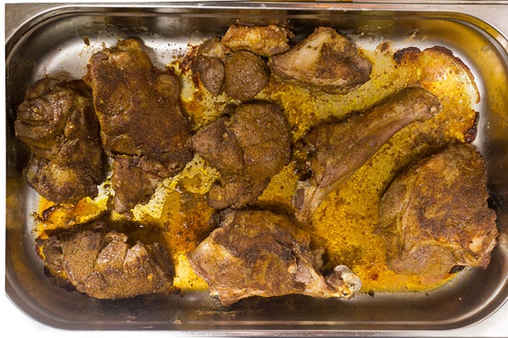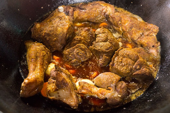 Перед закладкой риса мясо надо будет вынуть из казана. Только осторожнее — мясо неожиданно нежное, норовит разломиться на куски. Пока рано!