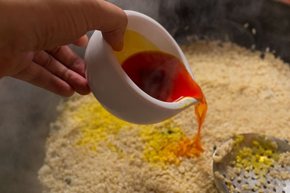 В этом плове лучше солить рис отдельно, пока на поверхности еще есть вода. Но наливать воду необходимо с учетом, что еще и шафрановым настоем надо полить рис!