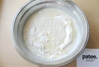 Постепенно соединяем муку с маслом, молоком, дрожжами, сахаром и солью.