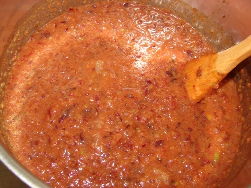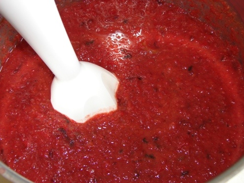 Провариваем еще минут пять всю массу. Затем отключаем огонь. Даем слегка остыть. Снова измельчаем блендером. На этот раз можно делать это прямо в кастрюле насадкой для пюре. В последний раз снимаем пробу. Соус должен получиться с приятной кислинкой, немного сладкий и острый. Остроту соусу из слив придаем ту, которая на наш взгляд является оптимальной. Для этого кладем столько перца стручкового, сколько понадобится. Еще острота зависит от самого перца. Не всегда он достаточно острый.