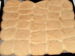 Готовим бисквитное печенье. Для этого понадобится рецепт классического бисквита при смешивании теста. Простой вариант тут не пройдёт. Тесто раскладываем на пергамент, хорошо смазанный сливочным маслом. Запекаем в нагретой духовке до 180 градусов Цельсия 10 минут. Затем досушиваем при 160 градусах ещё 15-20 минут. Для тирамису лучше испечь именно печенье, а не корж. Позже расскажу почему. Конечно, как легко понять из ингредиентов, можно воспользоваться готовыми дамскими пальчиками из магазина.