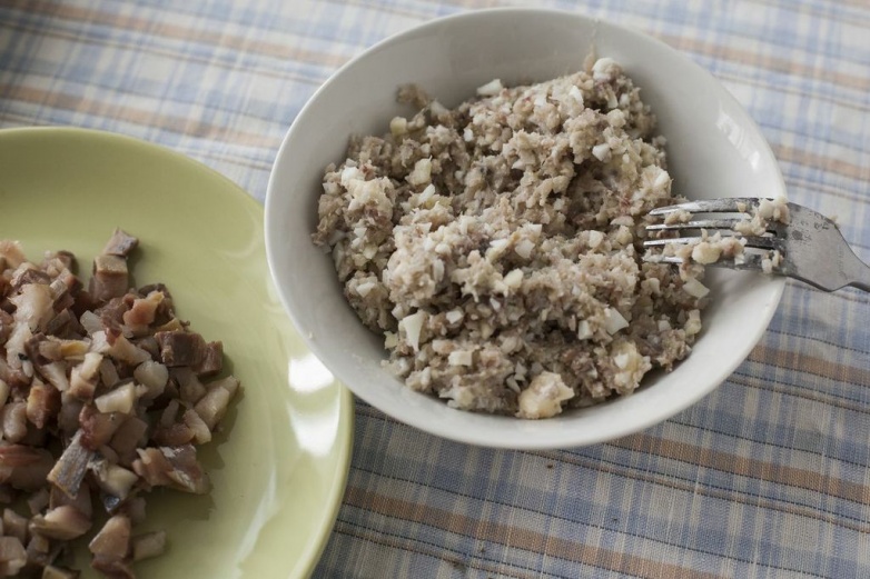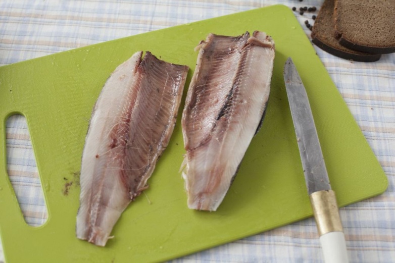 Селедку разделайте — отрежьте голову, удалите внутренности, снимите кожу и разделите на два филе.