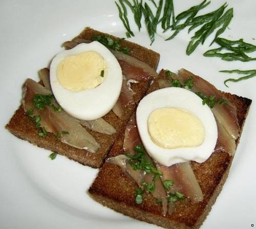 Гренки из черного хлеба смажьте тонким слоем масла, сверху уложите ломтик сваренного вкрутую яйца, на него — свернутую колечком кильку (или шпротину) и украсьте укропом или зеленым луком.