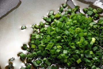 В сотейнике разогреть оливковое масло. Как только масло прокалится, обжарить на нем в течение 30 сек мелко нарезанный зеленый лук — только перо.