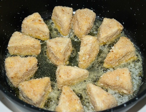 3. Обжаривать запанированный сыр до образования ровной хрустящей корочки. Подавать горячим с клюквенным вареньем или джемом.
