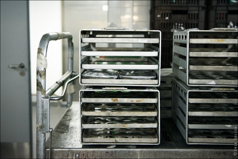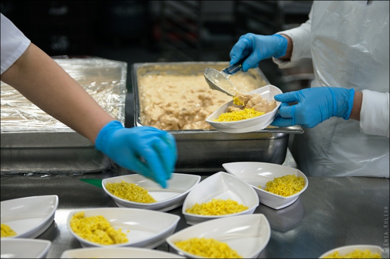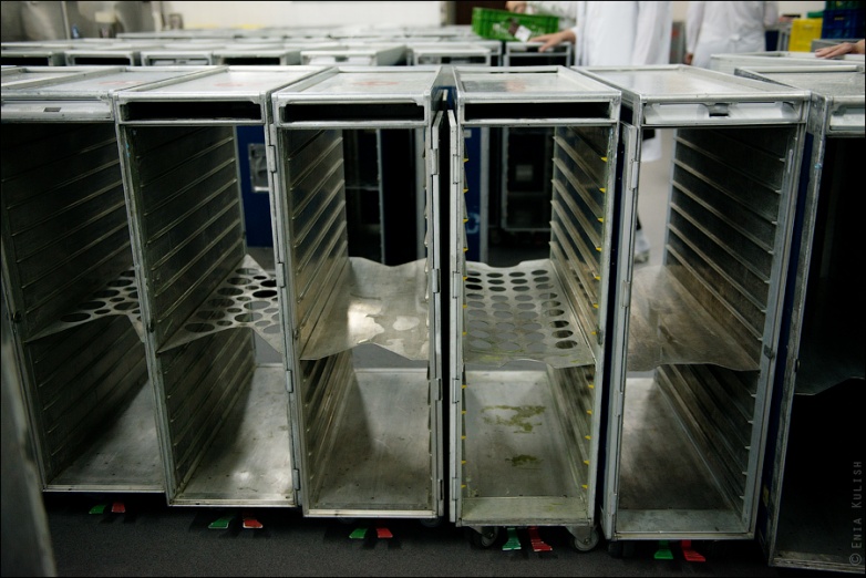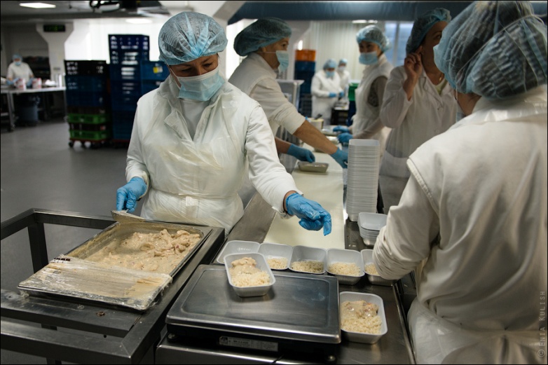Здесь формируют непосредственно порции, такими, какими они будут поданы в самолете… Курица с рисом или мясо с картошкой? Все тщательно маркируется наклейками определенных цветов!