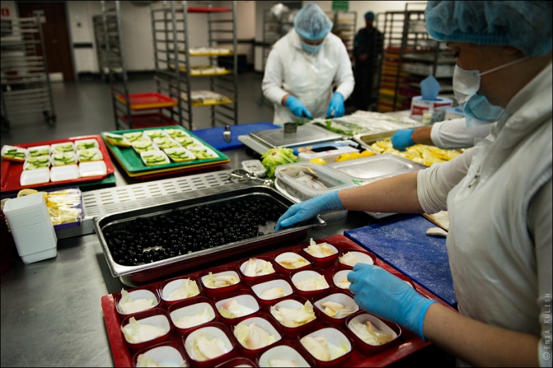 Откуда еду забирают уже для непосредственной фасовки в пайки, которые будут раздаваться в самолете!