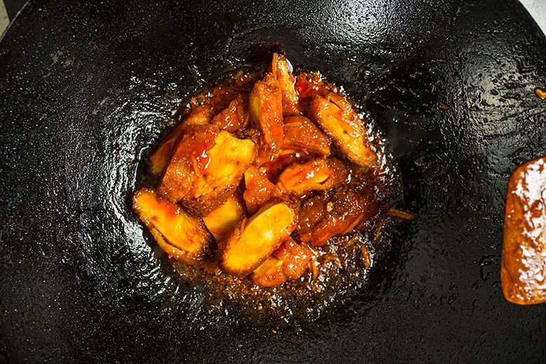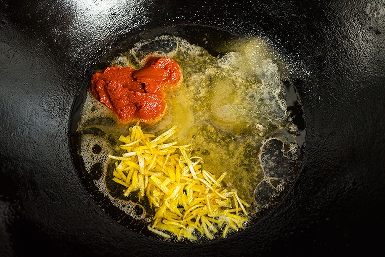 Положите в вок или в казан две ложки сахара, полейте его столовой ложкой лимонного сока, положите две ложки томатной пасты, добавьте две ложки воды, пол чайной ложки соли и поставьте все на огонь.