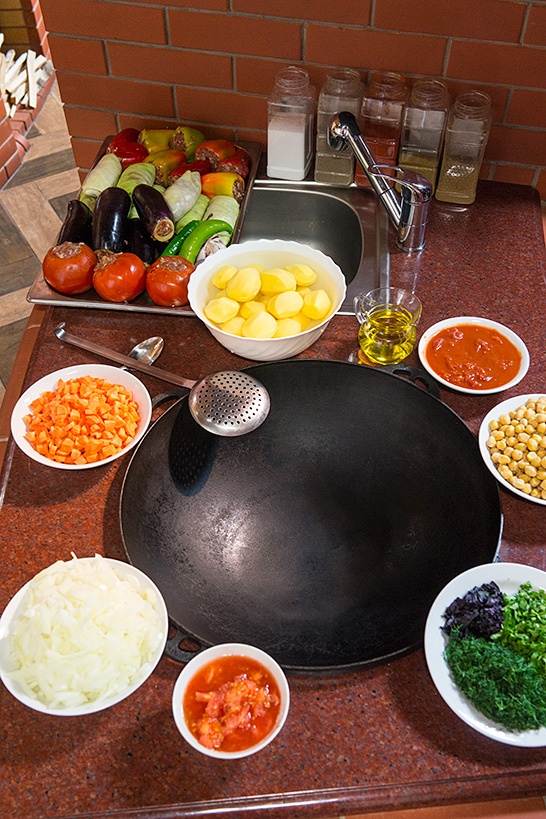 Небольшую часть соуса надо оставить на дне казана, на него выложить картофель и посолить. Поверх картофеля сначала голубцы из капусты — они могут готовиться дольше всех, им не страшно, болгарские перцы, сверху — более нежные баклажаны, а помидоры — на вершину пирамиды. Словом, расположение продуктов в казане должно соотноситься с их нежностью и с количеством тепла, которое они должны получить, чтобы стать готовыми.