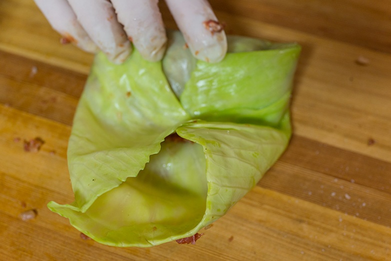 Жесткие прожилки в капустных листах надо слегка отбить, а лучше покупать для такого дела молодую, еще нежную капусту.