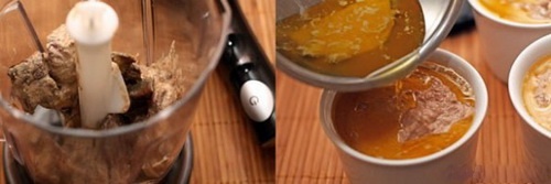 Когда печень немного остынет, отправляем все содержимое сковородки в блендер и тщательно измельчаем до однородной гладкой массы. Готовый паштет раскладываем по формочкам, аккуратно разравнивая. Оставшееся сливочное масло растапливаем на водяной бане. Понадобится только прозрачный верхний слой. Не спеша наливаем масло в каждую из формочек с паштетом.