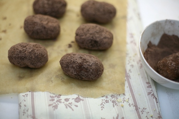 Обвалять их в смеси какао-порошка и сахарной пудры (по одной чайной ложке с горкой). Дать полежать и обвалять еще раз.