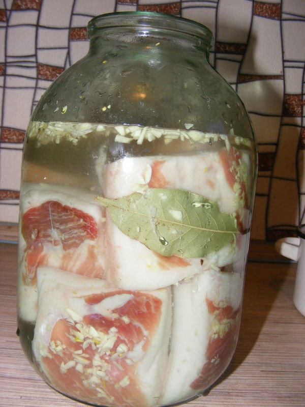 Уложить сало в банку, плотно, но без фанатизма, чтобы был зазор, иначе есть риск, что продукт затухнет. Между кусками накидать перца и лаврушки.