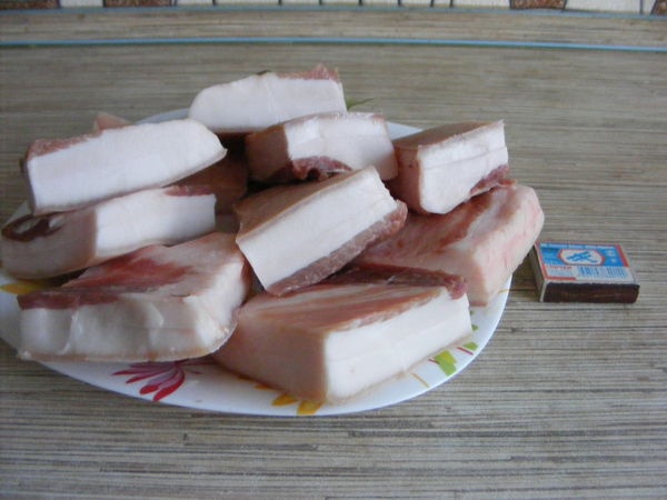 Пока варится соль с водой сало порезать на куски, какие больше нравятся — мне нравятся такого размера, чтобы входили в банку и потом доставались без проблем. В качестве мерила на фото — спичешный коробок.