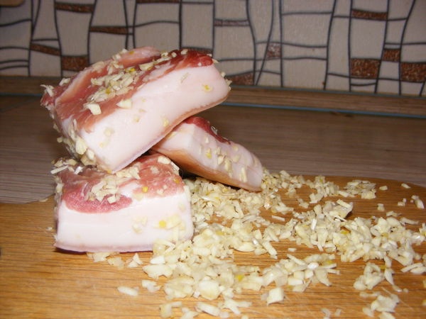 Далее мелко порубить чеснок (вот только ни в коем случае не чеснокодавилкой! только ножичком!) и натереть им каждый кусок.