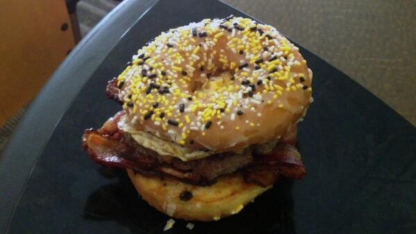 Это мечта любителя мяса. В разрезанный пополам и поджаренный пончик производитель помещает: омлет, бекон и котлету из говядины. Такое блюдо продают на стадионе PNC-парк. В гамбургере содержится 902 калории.