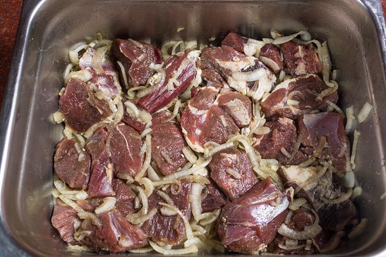 Конечно, в первую очередь необходимо само мясо, подготовленное как на шашлык. Неважно, какое мясо, неважно, какой маринад — это дело вашего вкуса и вашего выбора. Наверное, я бы воздержался только от маринадов на основе кефира и сейчас вы поймете, почему.
