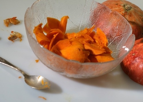 Разрежьте маленькую тыкву пополам, срежьте чуть-чуть основания половинок для устойчивости.