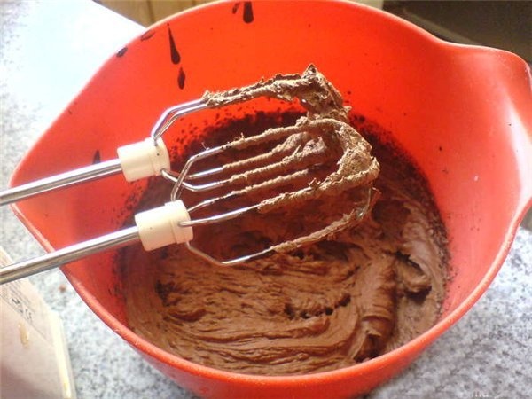Взбиваем на средних оборотах до тех пор, пока не увидим, что шоколадная эмульсия начинает густеть.