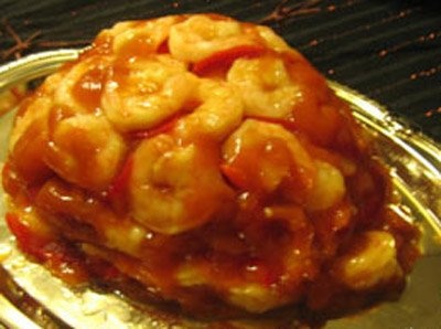 Выкладываем на тарелку основу. А затем превращаем невинное блюдо в кровавый деликатес при помощи верхнего слоя из креветок и кетчупа. Вот и все дела!