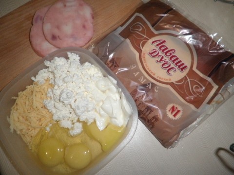 Натираем твердый сыр. Смешиваем со сметаной, творогом, яйцами. Разворачиваем лист лаваша, визуально делим на 3 части и на среднюю часть выкладываем начинку.