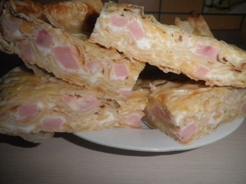 Сварачиваем пласт пополам. Форму для выпечки в духовке смазываем сливочным маслом или сливочным маргарином. Перекладываем подготовленный пласт, сверху намазываем остатками начинки, но уже без колбасы.
