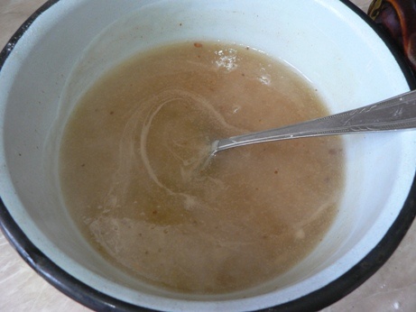 Для этого в бульон добавляем китайский соевый соус, оставшуюся чайную ложку кунжутного масла, винный уксус, примерно пол чайной ложки соли, полторы чайные ложки сахара, немного молотого красного перца (если любите острый вкус побольше), выдавливаем сюда же оставшийся чеснок – размешиваем. В полученную смесь всыпаем картофельный крахмал и снова всё тщательно перемешиваем.