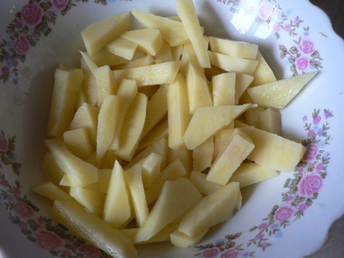 Тоесть, тоже в форме брусочков, примерно с палец толщиной. Подготовленный (поджаренный) картофель снимаем со сковородки и выкладываем на тарелку.