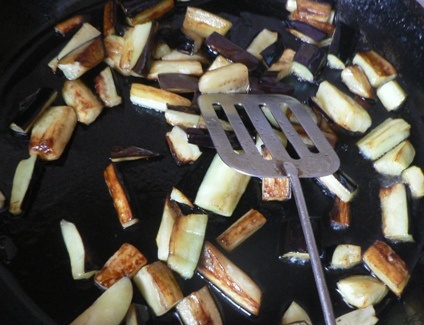 На освободившееся место всыпаем баклажаны и жарим их, переворачивая, до готовности (они становятся прозрачными). Не допускайте, чтобы баклажаны развалились, они должны иметь первоначальную форму.