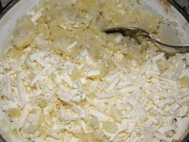 Измельченную начинку перекладываем в глубокую миску и хорошо все перемешиваем ложкой. При желании можно начинку посолить и поперчить по вкусу. Главное придерживаться соотношения сыра к картофелю в пропорции 1 к 2. Ну а там по вашему усмотрению. Если вы любите, чтобы в блюдах в большей степени был творог, тогда его количество можно и увеличить.