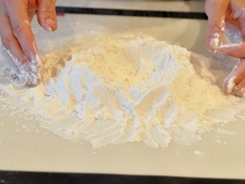 Итак, в глубокой миске или на кухонном столе делаем из муки горку. С помощью пальцев делаем небольшое углубление на мучной вершине и вливаем туда воду с помощью стакана. Руками начинаем постепенно замешивать тесто.