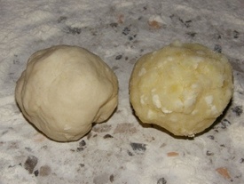 Скатываем руками небольшие шарики из начинки и теста размером с ладошку. При этом теста должно быть примерно в два раза меньше, чем начинки.