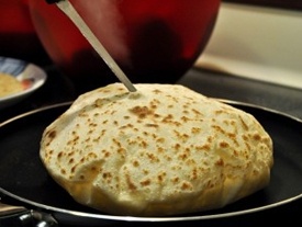 Хичин выкладываем на заранее разогретую сковороду. Лучше пользоваться чугунной сковородой или сковородой с тефлоновым покрытием. В другом случае тесто начнет прилипать и пригорать к основанию инвентаря. Обжариваем с двух сторон на среднем огне буквально 2-3 минуты. Определяем готовность блюда по образованию на поверхности теста коричневых, поджаренных и небольших по размеру пятен.