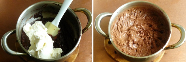 6. На водяной бане растапливаем шоколад. Если он плохо топится, можно добавить 1-2 ст.л. сливок. К растопленному шоколаду добавляем 1/3 сливок с агаром. Тщательно перемешиваем. Лучше миксером/блендером.