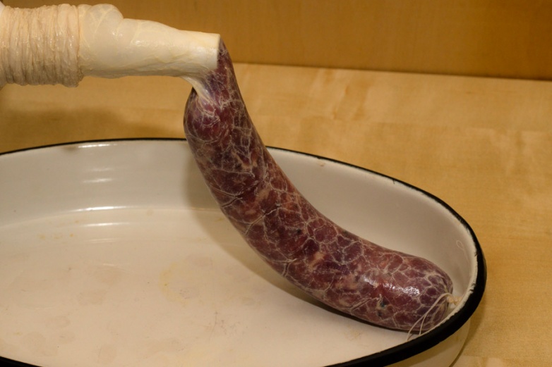 Заканчивая одну колбаску завязываем край ниточкой. Потом на расстоянии 1-2 сантимерта привязываем еще одну ниточку (начало новой колбаски) и продолжаем набивку. Потом очень удобно разрезать колбаски между ниточками.