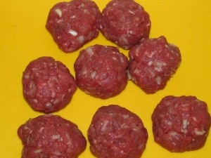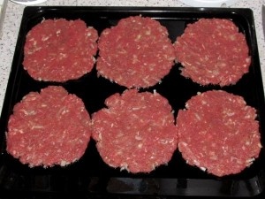 Добавляем лук в уже маринованный фарш. Делим на кусочки равной массы по ~100 гр.