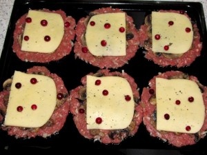 Далее идёт тонкий ломтик сыра. И на каждую котлетку я кладу пять ягодок клюквы.