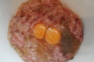 Вбить в фарш яйца, посолить и приправить специями. Хорошо вымешать.