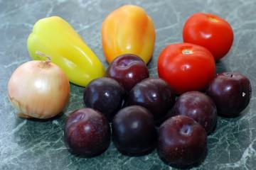 Уложить нарезанные сливы поверх лука и перца. Посолить и поперчить.