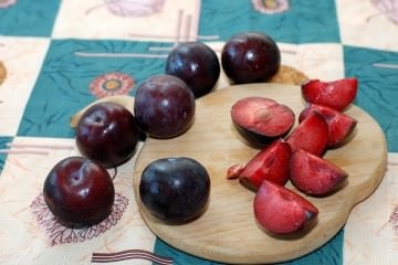 Сливы вымыть, тщательно оттирая сизый налет, разрезать на 4 части и удалить косточку. Сливы лучше всего брать не переспевшие, а слегка недозрелые, совсем чуть-чуть. И желательно с красной мякотью.