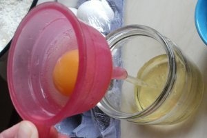 Хорошо получается отделять белки через лейку. Для этого нужно аккуратно разбить яйцо и вылить его в лейку. Двигайте лейку так, чтобы желток начал совершать круговые движения, постепенно белок начнет вытекать вниз.